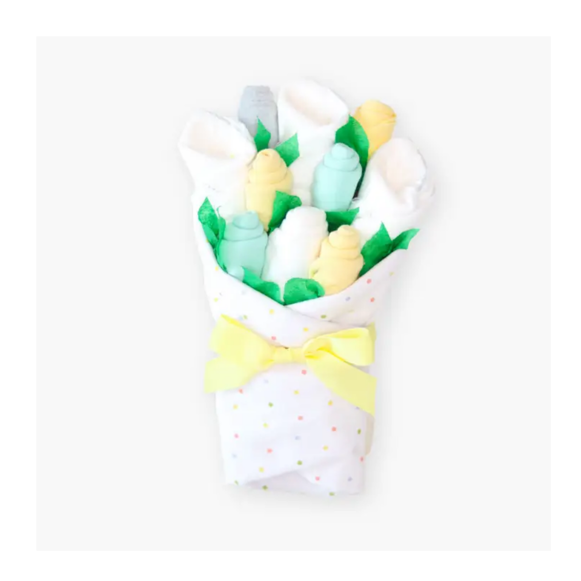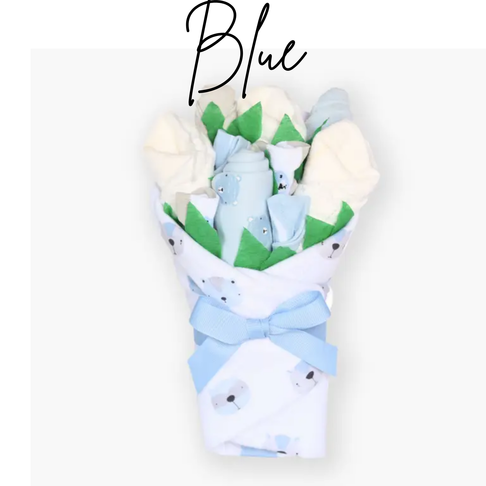 Adorable and unique! Flowers are shaped from various baby items such as blankets, hats, bibs, socks and onesies. Choose color of gender neutral, pink or blue bouquets. Ships with flat rate of $9.99.