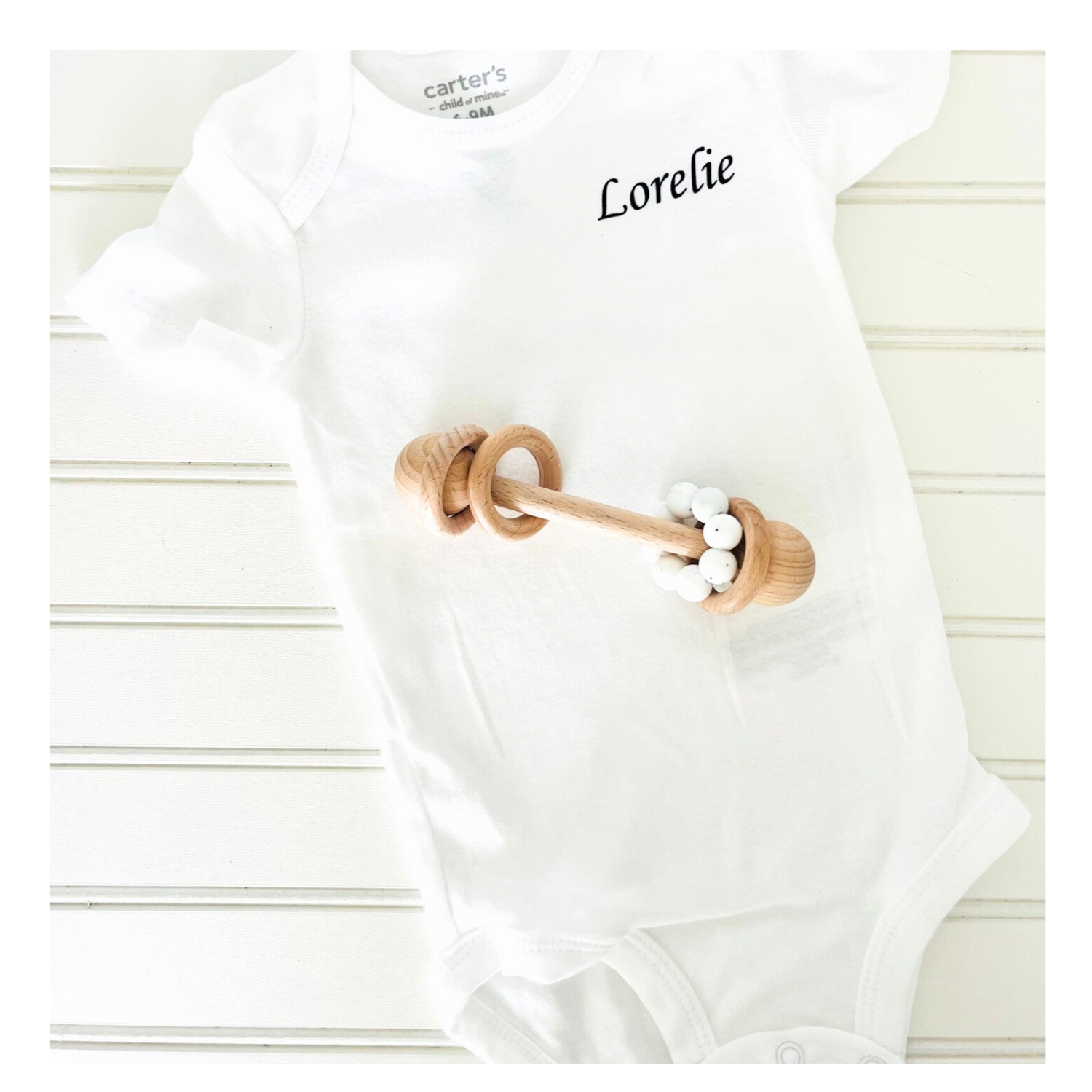 Our organic cotton onesie can be customized with your name or message. Allow 2-3 days for design. Rattle not included but can add in the Design Your Own Gift option.
