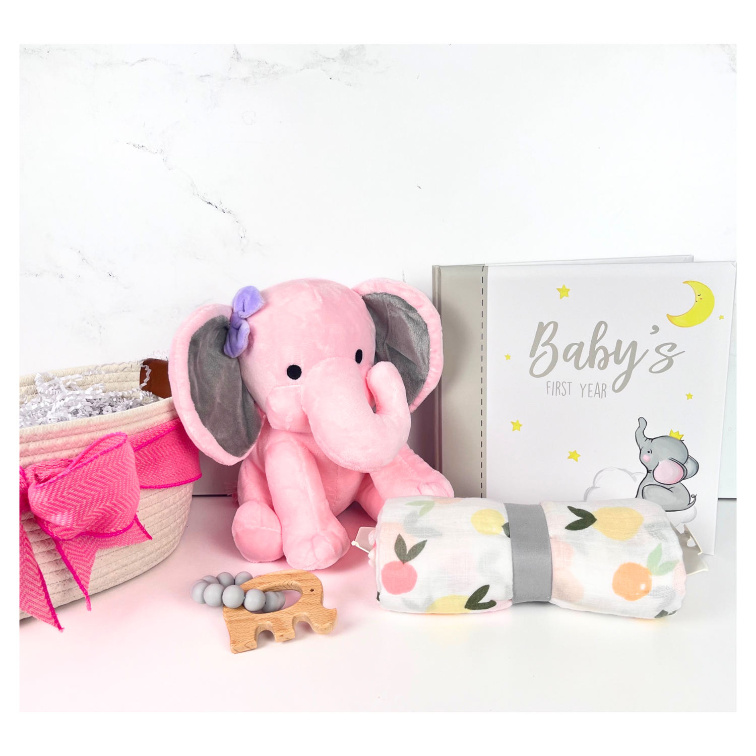 Our pink elephant can be personalized at no additional charge. Put baby's name, initials or birthdate on ear(s). White reusable gift basket also includes swaddle blanket with pastel citrus theme, elephant wood and silicone rattle and Baby First Yearbook for recording notes and important milestones!