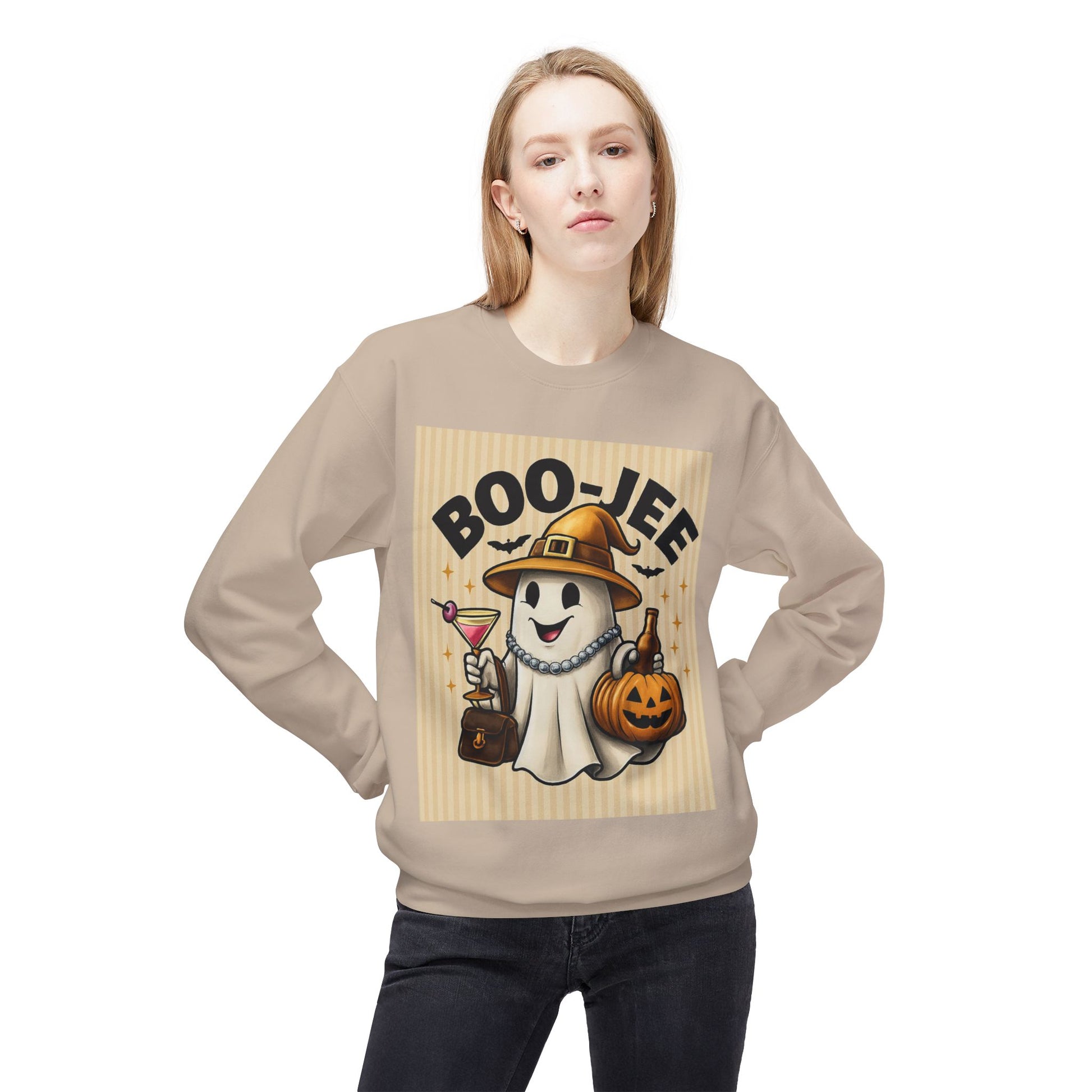 Boo-Jee Ghost Crewneck Sweatshirt, Halloween Sweater, Unisex Fleece Top, Festive Lounge Wear, Cute Ghost Apparel