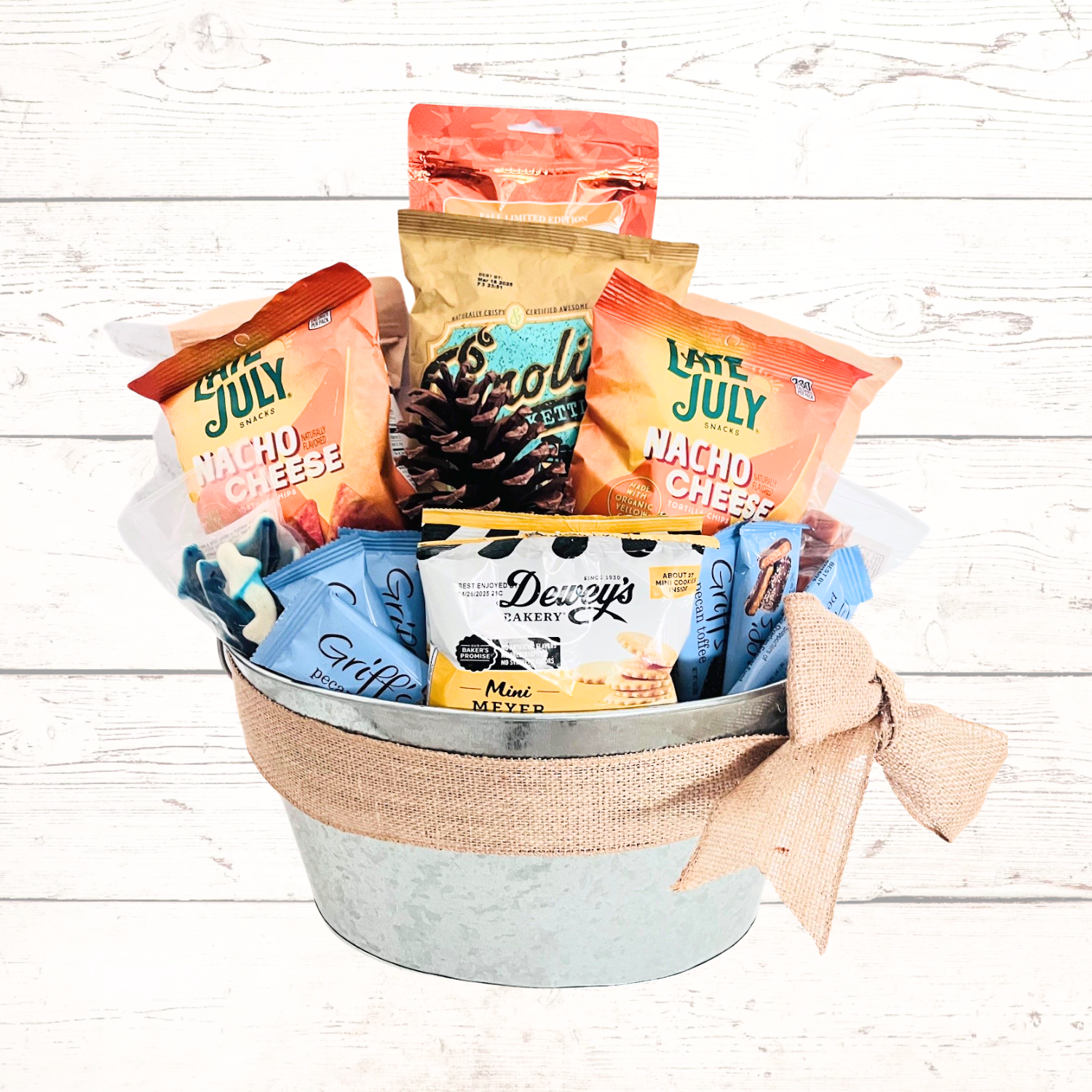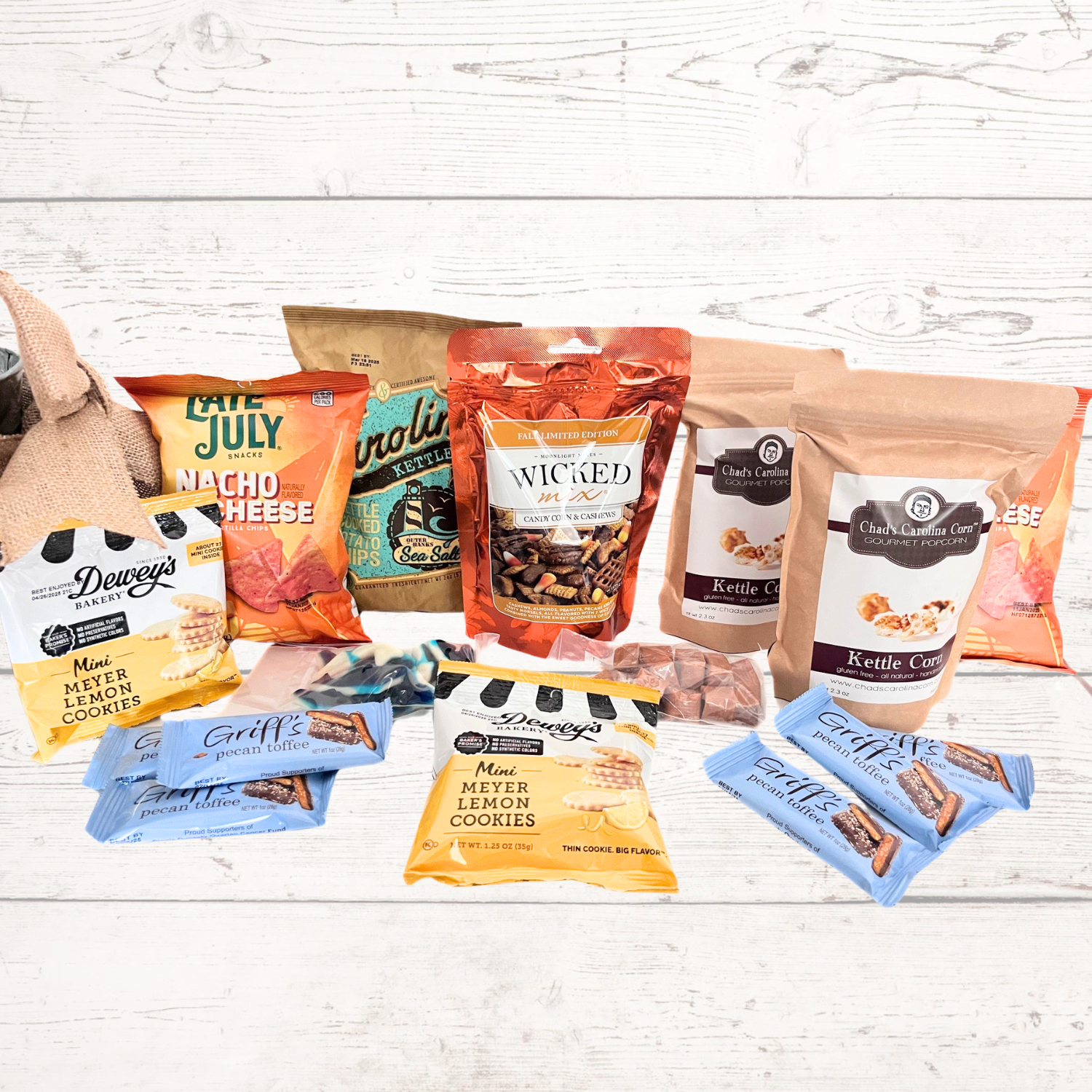 Our large Carolina Crowd Pleaser is the perfect gift for an office, client or family. Includes a variety of sweet & savory favorites. All items are NC made by small artisan businesses. Dewey's lemon cookies, Griff's toffee bars, tortilla chips, potato chips, Chad's Carolina Corn and more!