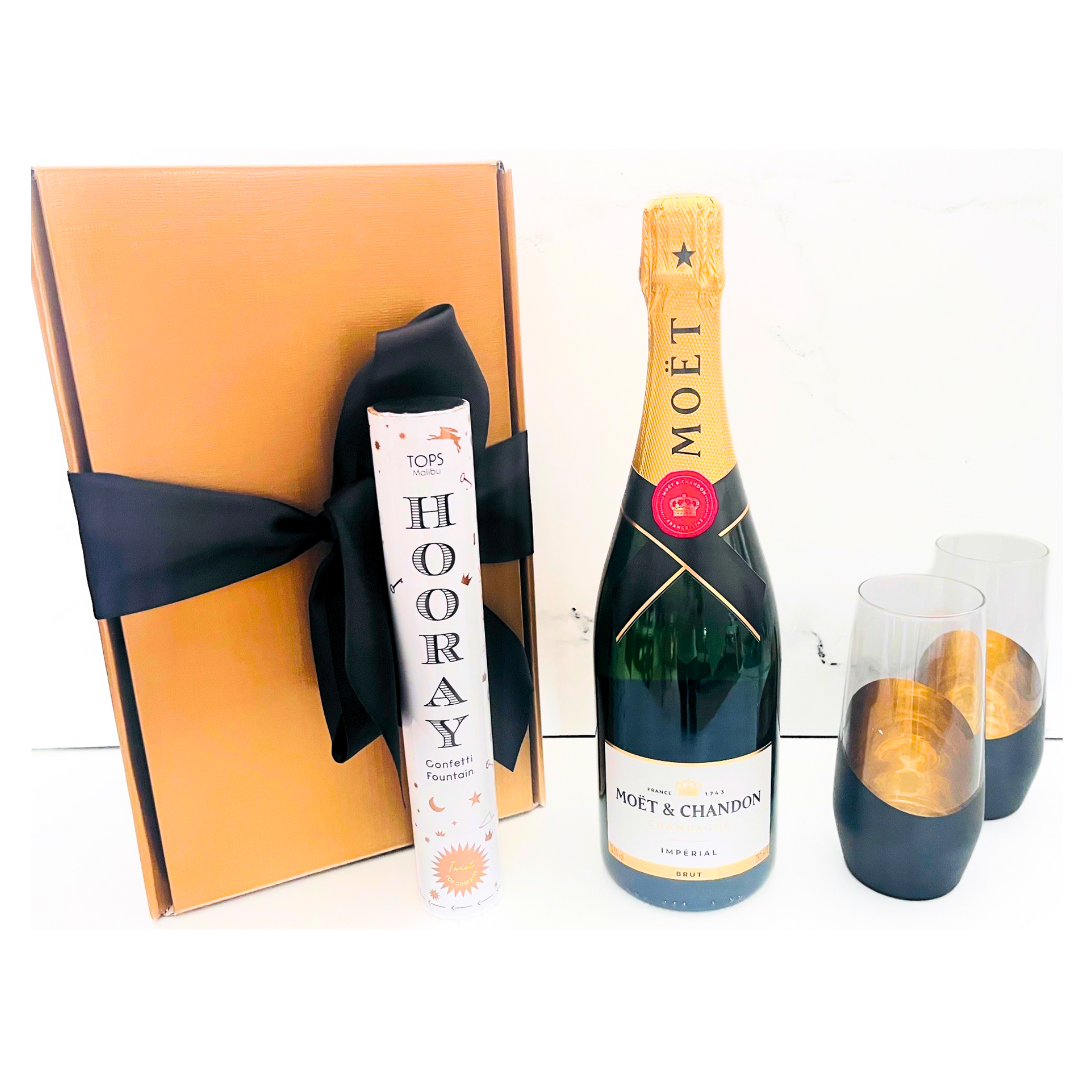 This is the perfect gift for any memorable milestone or celebration. Includes full bottle of Moet Chandon, Hooray confetti cannon, and two modern stemless champagne glasses. All wrapped up in a gold box with black satin ribbon. Great for weddings, engagements, anniversaries, new baby, new job or promotion, graduation, housewarming or more!