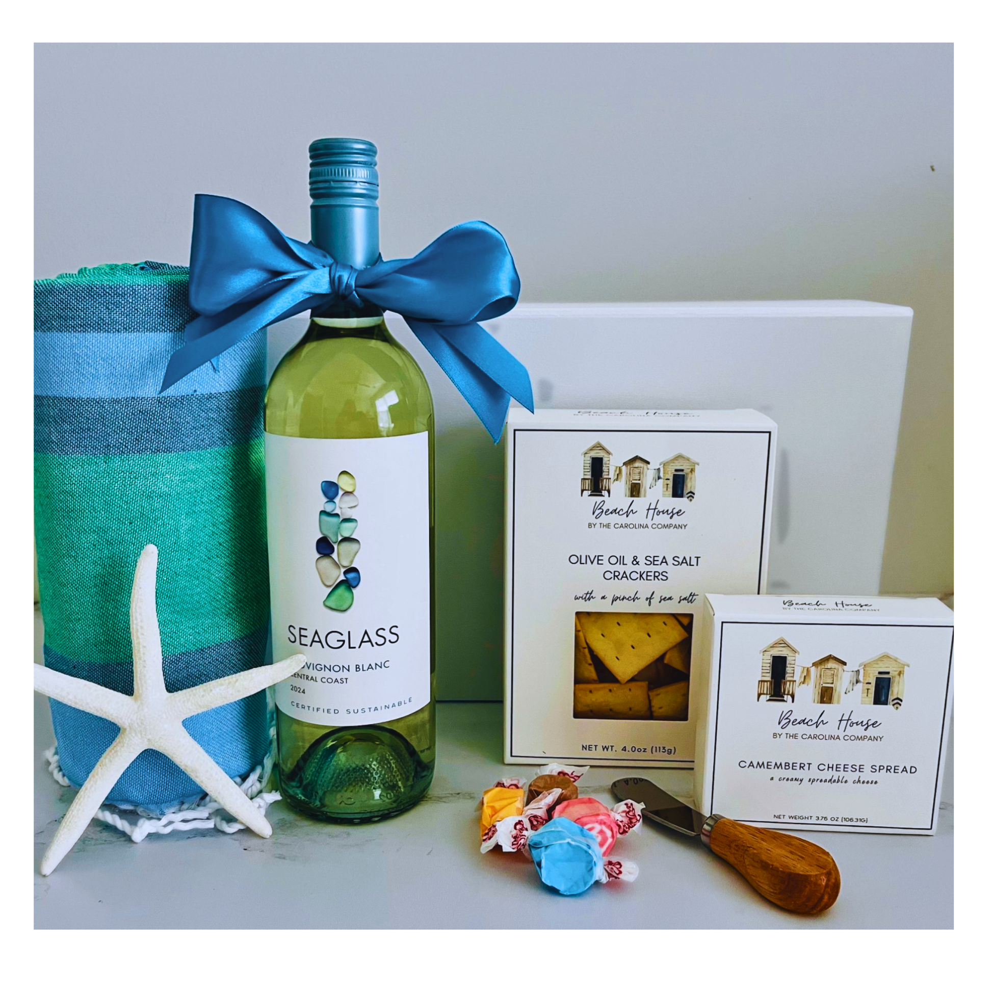 Our Coastal Vibe Gift Box is perfect for Mother's Day or for any beach lover! Includes magnetic gift box, Sea Glass Wine, Luxury multicolored sustainable Turkish beach towel/wrap, Beach House Crackers and Beach House Camembert Cheese. Complete with salt-water taffy and real starfish. Wrapped up with white shred and coordinating silk bow.