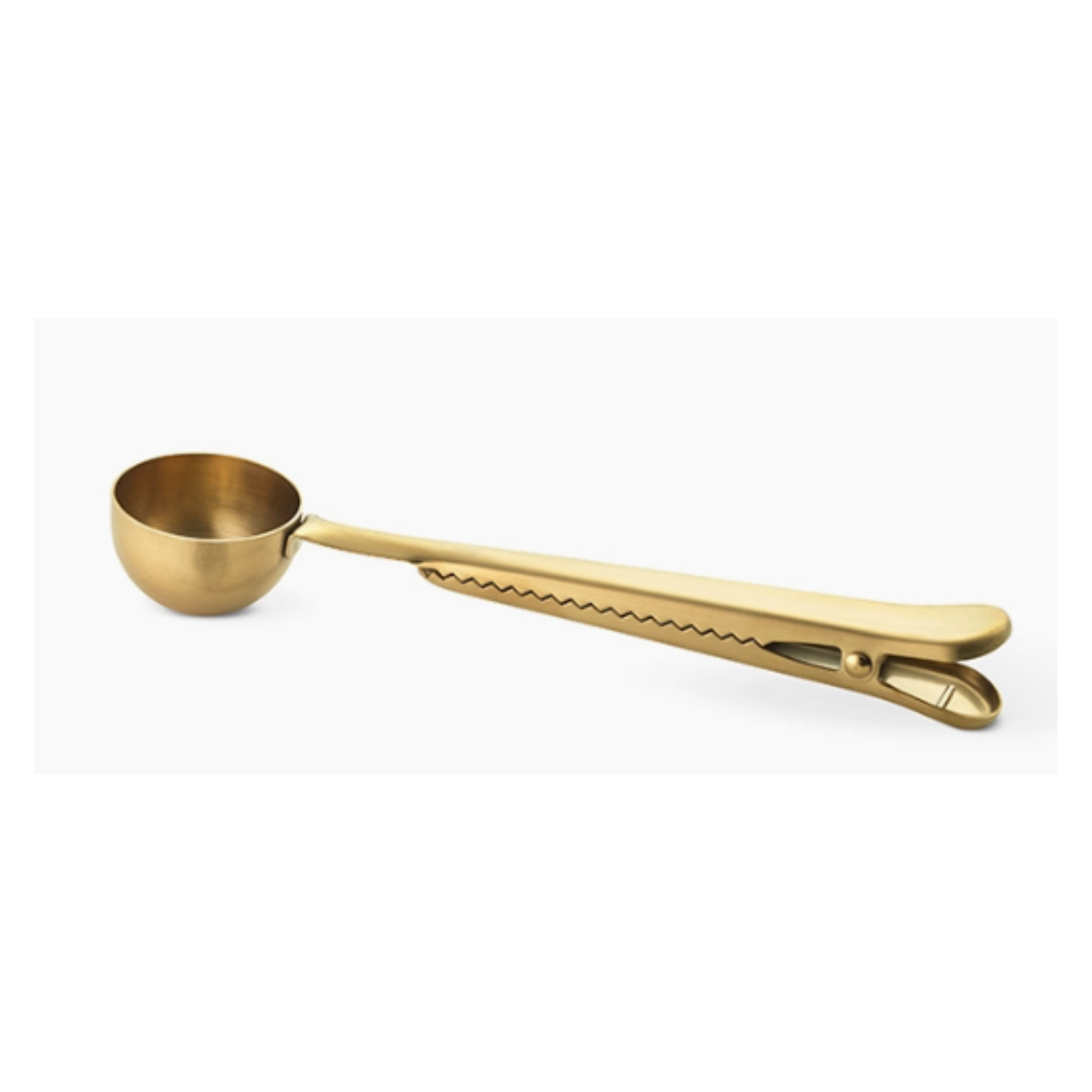 Gold clip handle coffee scoop - so handy for your coffee bags at home, each scoop measures out enough ground coffee for two cups brewed. The handle is a springed clip to keep your bag closed. Made of dishwasher safe stainless-steel and packaged in a neat kraft box.