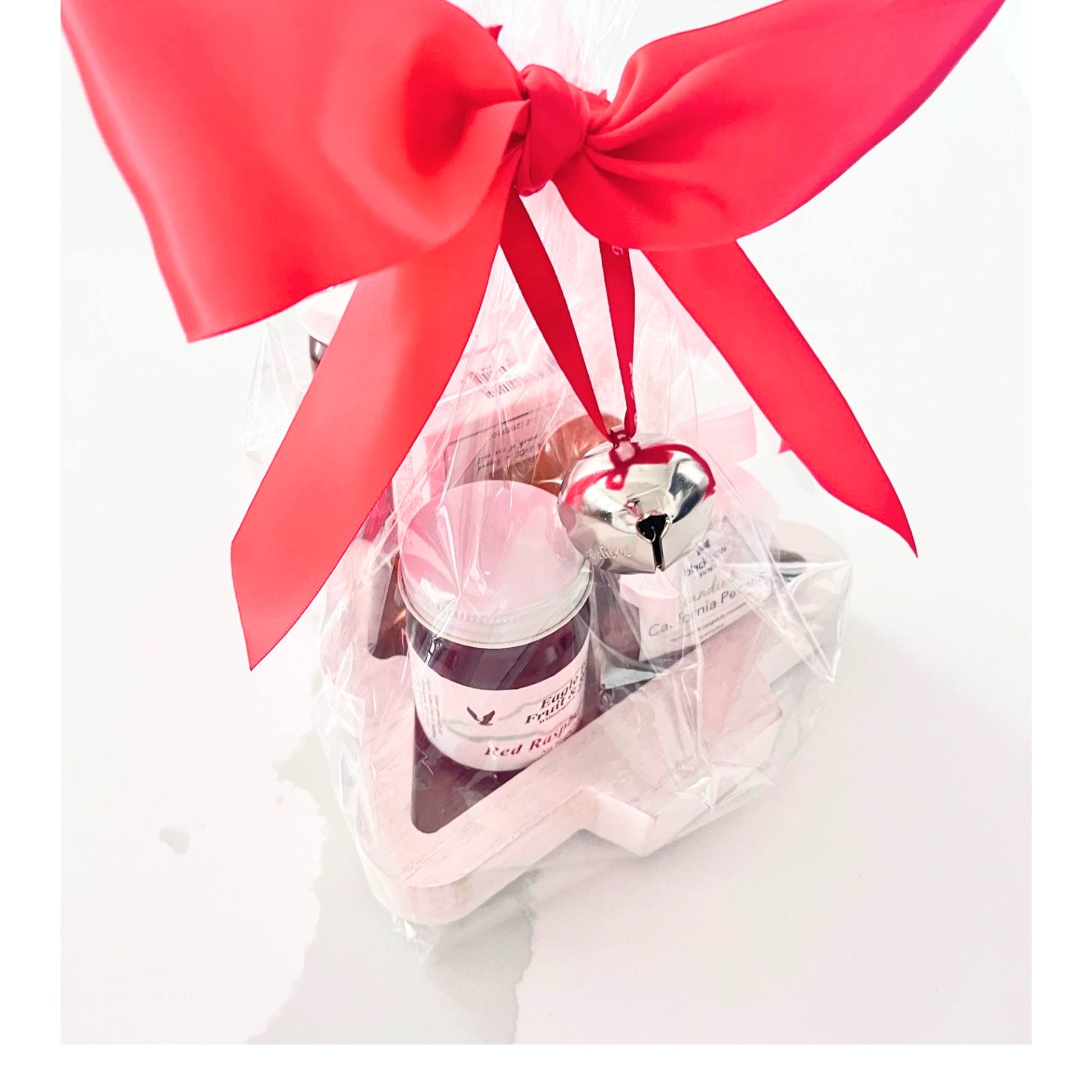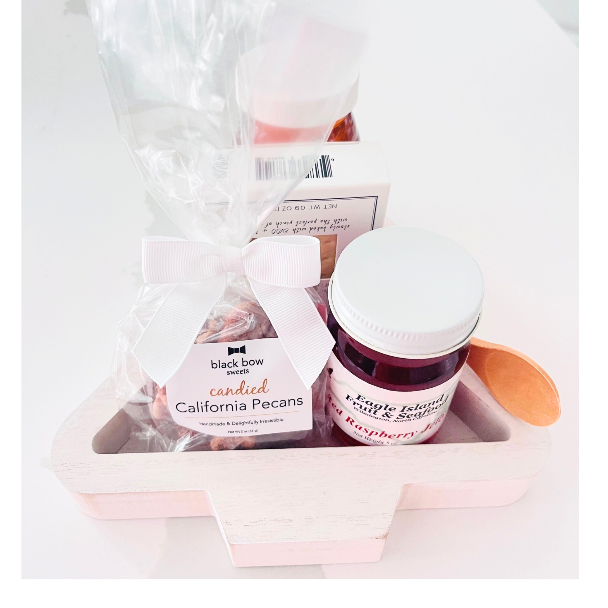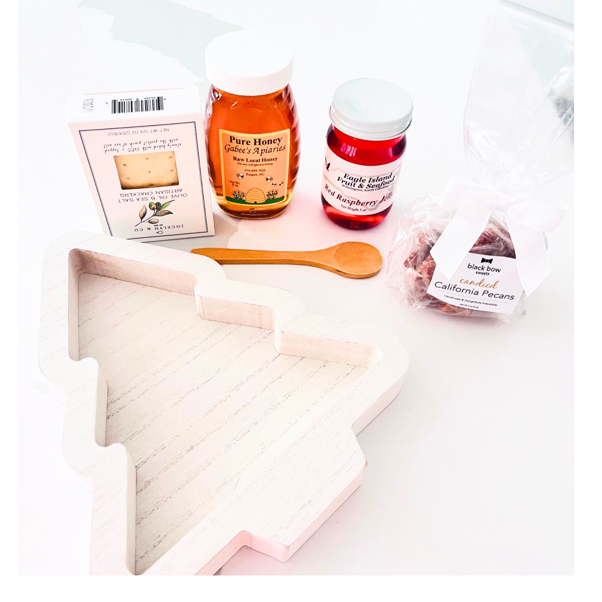 This cute white wood holiday tree dish comes with local honey, jam, spoon, crackers and cinnamon dusted pecans. Perfect hostess, co-worker gift, dog groomer/sitter, neighbor, or for anyone.