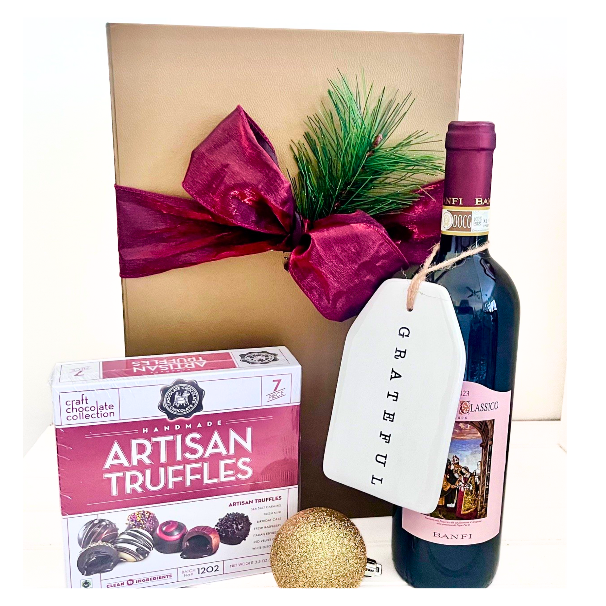 Raise a glass to our Sip & Sweets gift set—the perfect pairing of premium cabernet (or wine of your choice) alongside decadent artisan truffles that'll make taste buds dance. Each box arrives beautifully presented in shimmering gold packaging with festive touches that say celebration. Cheers to good taste!