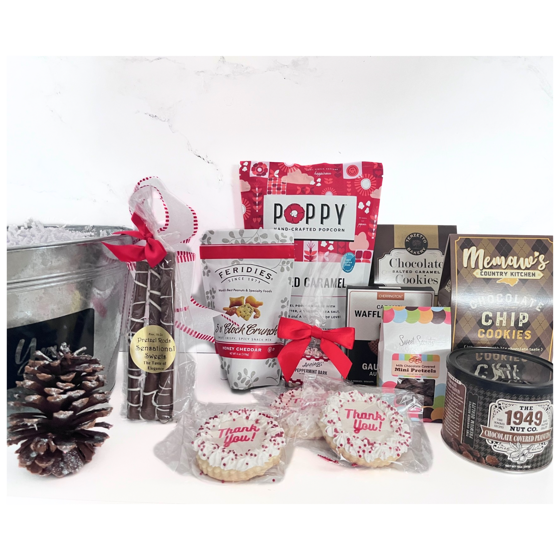 Perfect large gift for a team, office or family! Includes shareable gourmet Poppy's caramel corn, snack mix, chocolate chip cookies, chocolate covered pretzels, caramels, toffee bars, flatbread crisps, mixed nuts, chocolate covered peanuts, 3 of our white chocolate iced Thank You cookies - something for everyone!