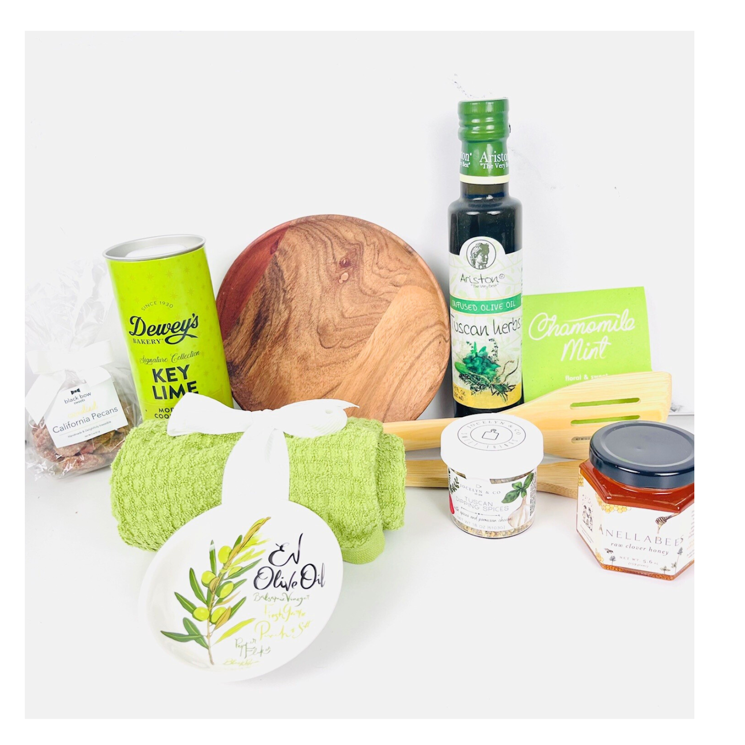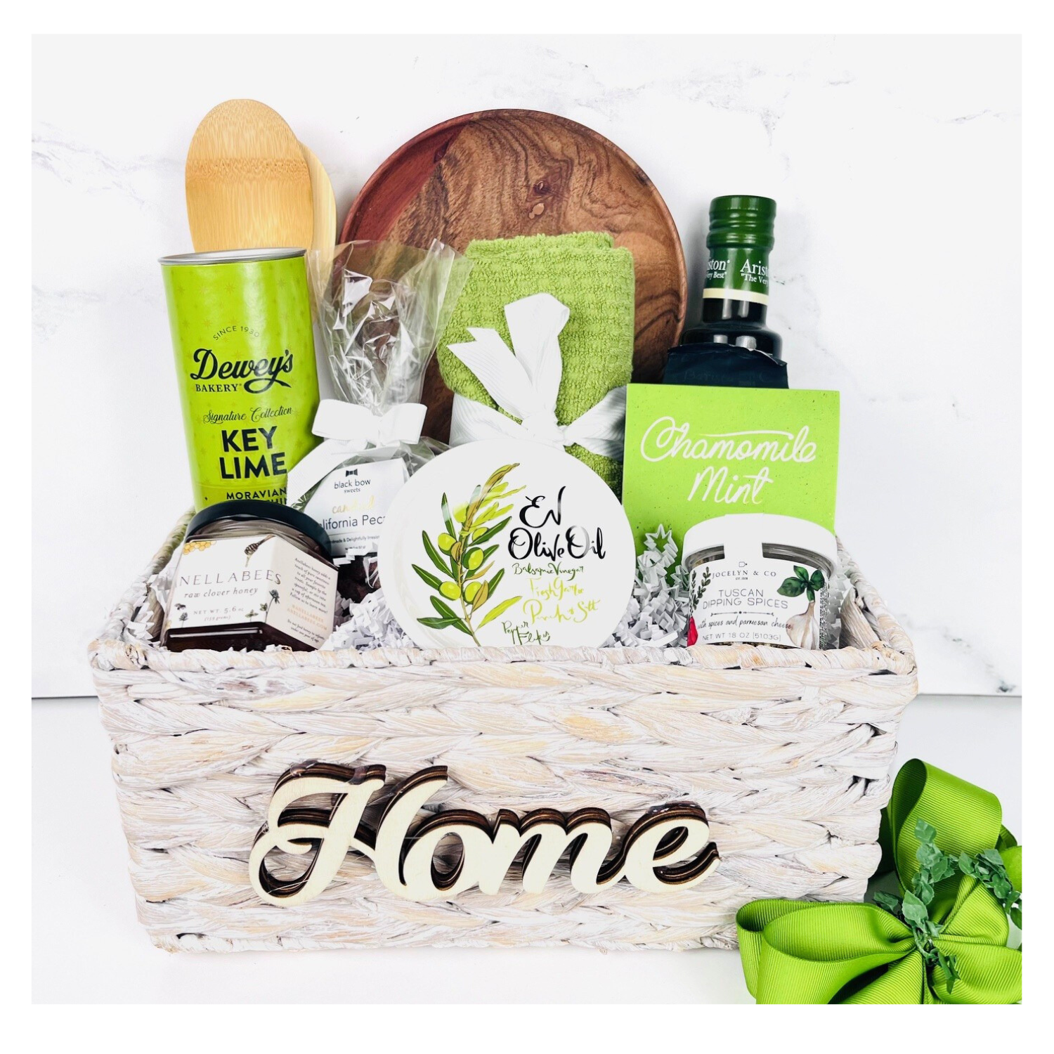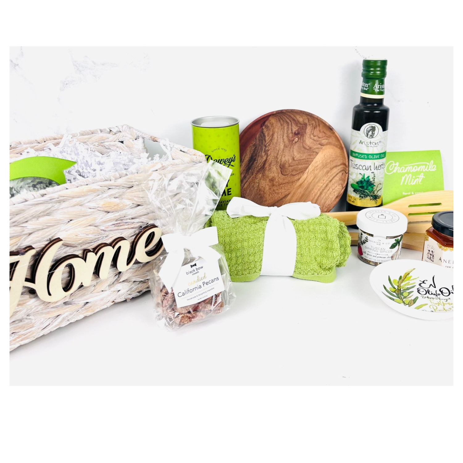 Looking for the perfect gift to send to a client or friend and family for a new home? This gift has everything to bring a smile to a homeowner, such as a whitewashed basket, wooden accent dish, honey, tea, key lime cookies, candied pecans, olive oil, dip mix, dipping dish, and tea towel. Basket has wooden letters that say "Home," but can be delivered with no letters, or the words Cheers or Gratitude.