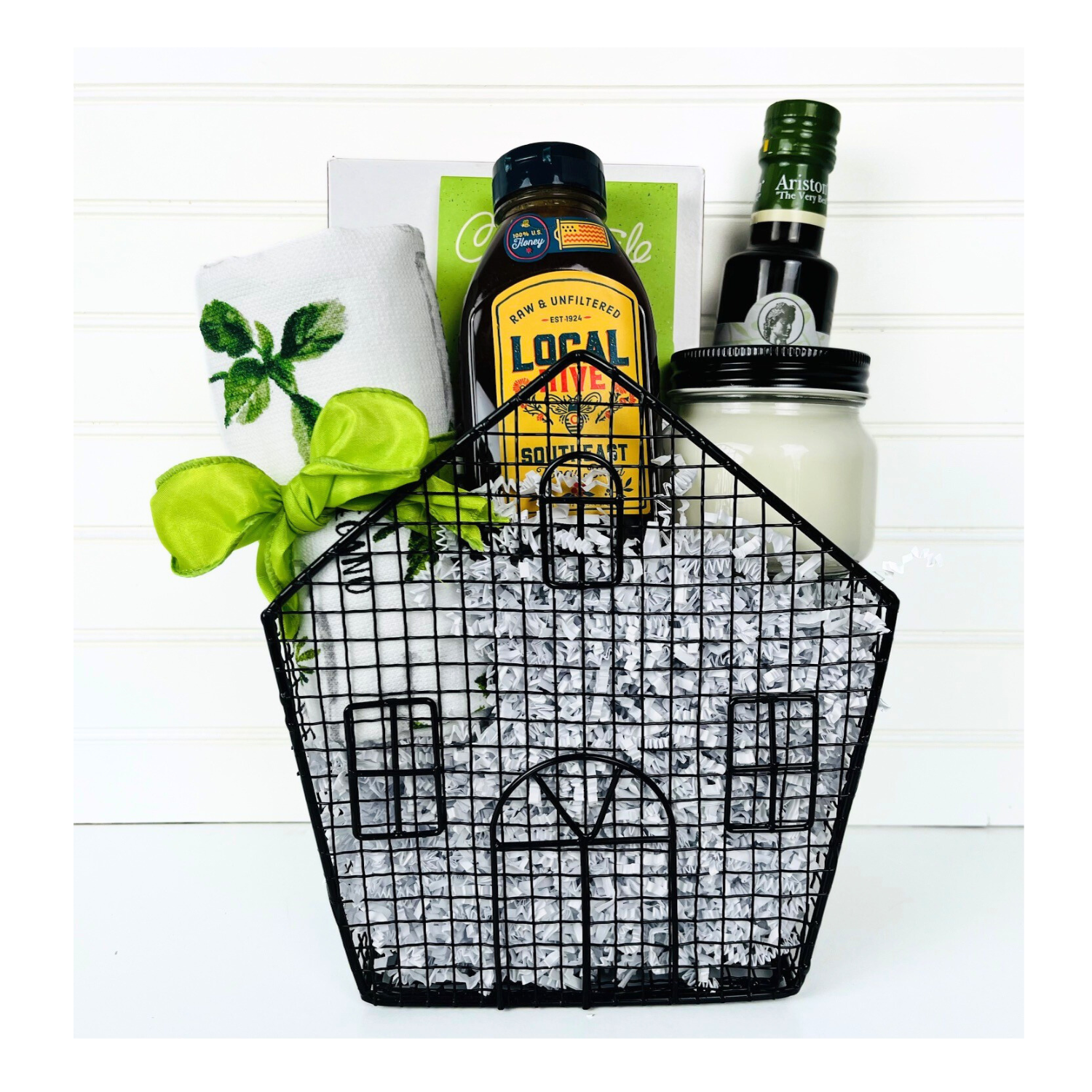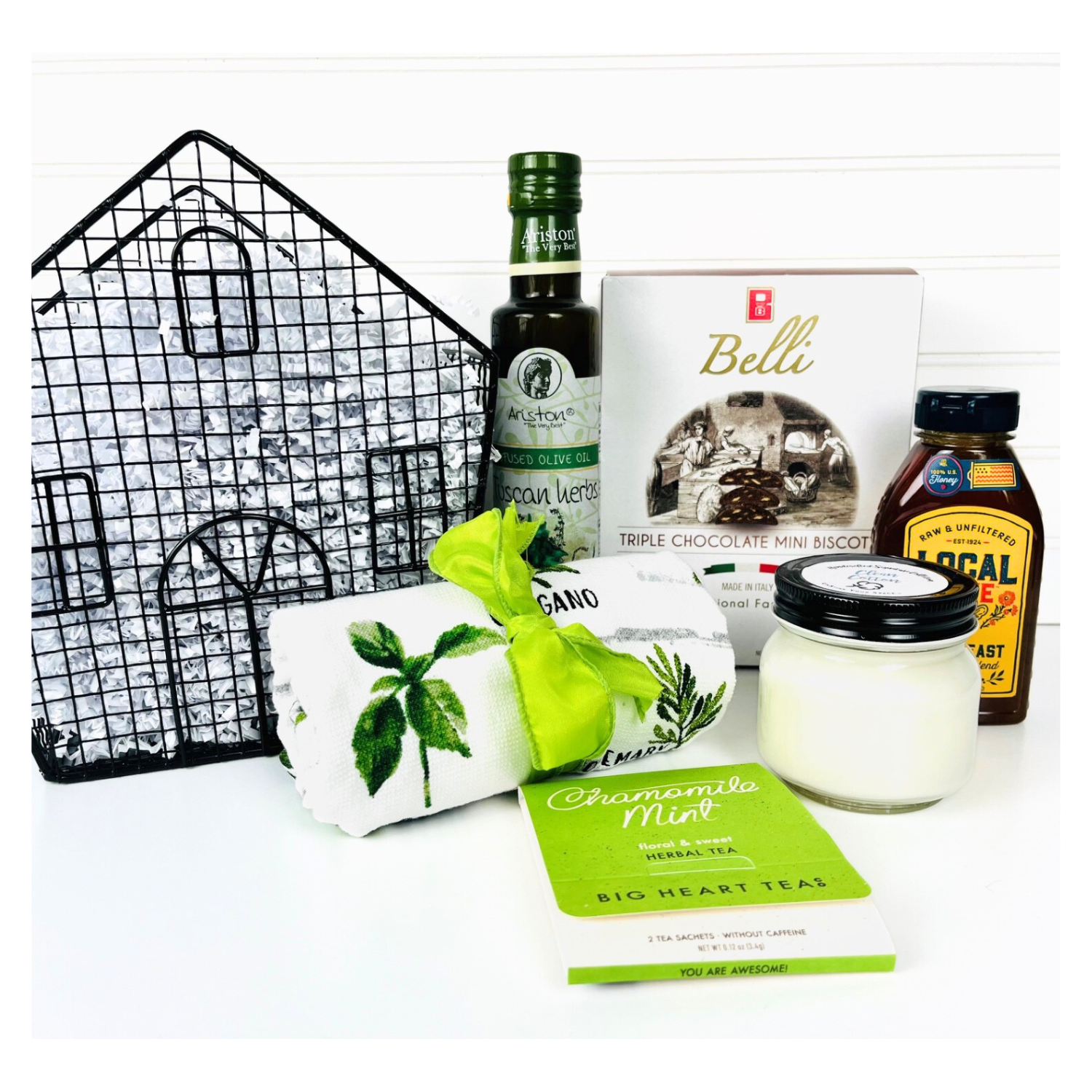 Our Home Gourmet gift is perfect for a new homeowner, home anniversary, or completion of a home redesign. Includes local honey, Chamomile tea, small coffee, biscotti, decadent olive oil, mason jar candle and tea towel with herb theme. Wrapped up in cellophane with a bow and card.