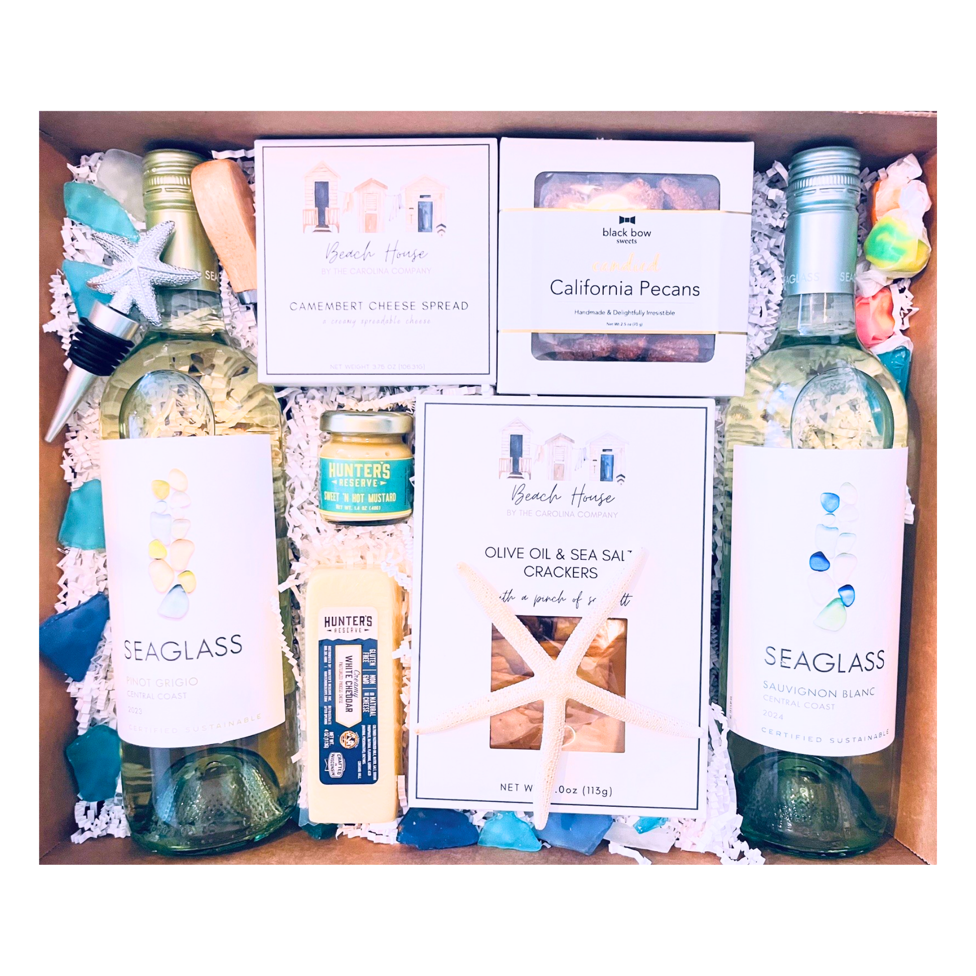 Large box tray includes two bottles of Seaglass Sauvignon Blanc & Pinot Grigio, our own Beach House Sea Salt Crackers, camembert cheese, cheddar cheese, cheese spreader knife, cinnamon pecans, mustard, saltwater taffy, starfish bottle stopper and starfish. Decorated with sea glass pieces.