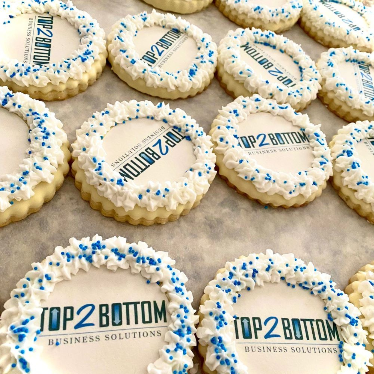 Our delicious cookies are made with white chocolate icing and can be customized with your logo or message. Price is for six 3-inch cookies and includes cellophane bag and bow and boxed for multiple order.