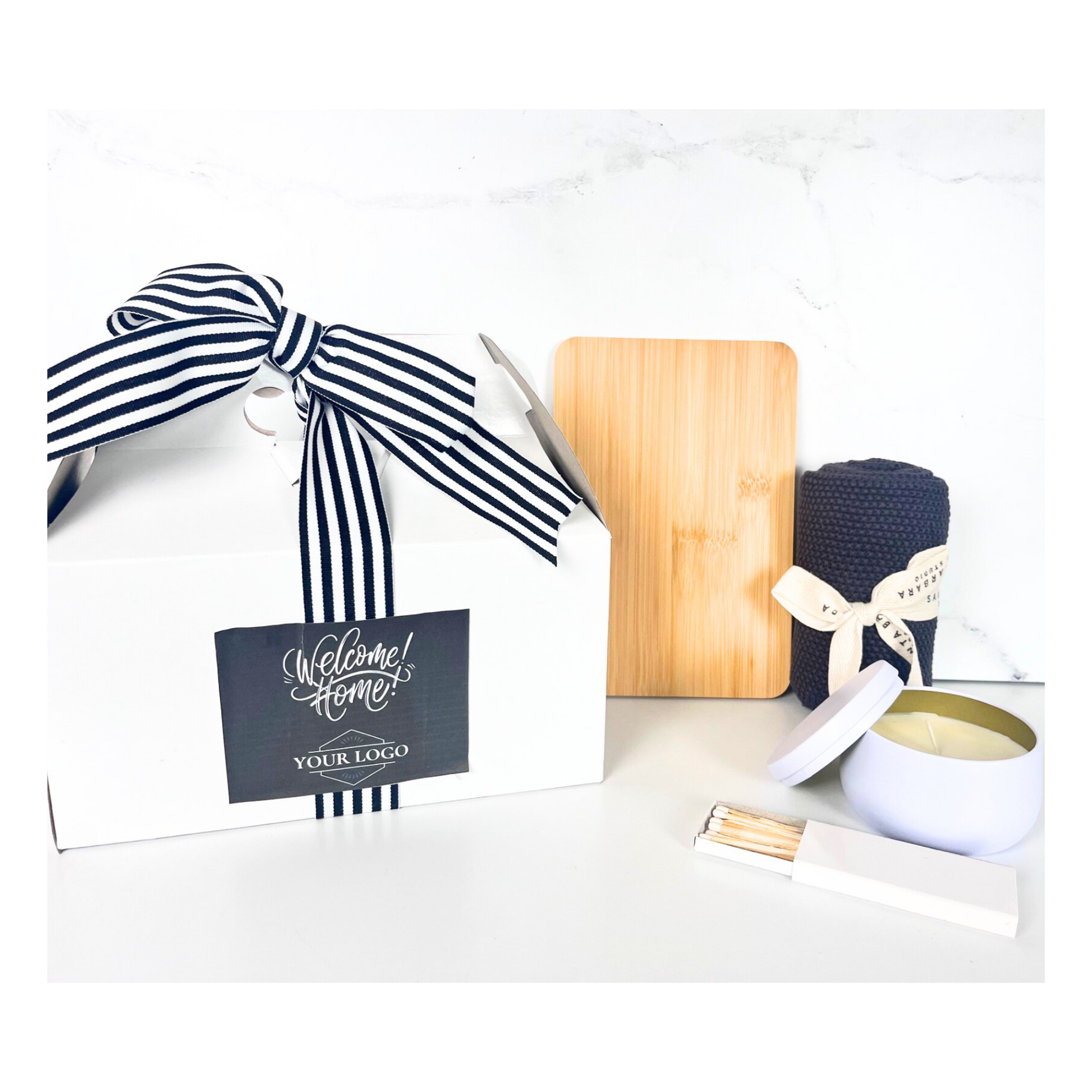 Our custom Gable Box includes a small wood cutting board, high quality dish towel, candle and matches. Add your logo or name to the front of box and top of candle at no additional fee.