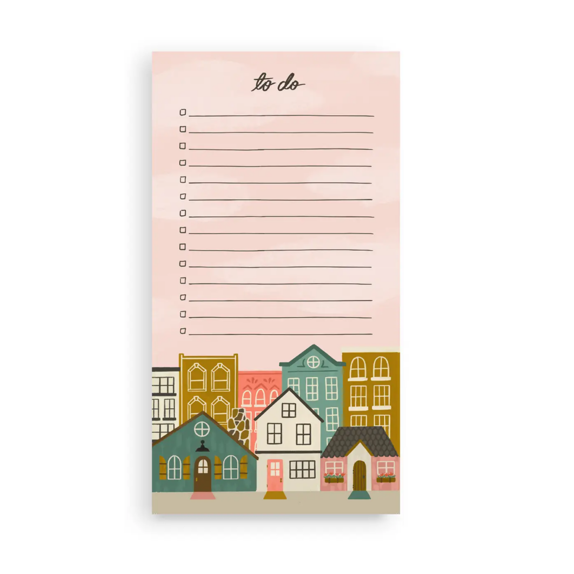 Love Your Neighbor! This hand illustrated notepad will inspire you to think of others in your home and community as you work through your to-do list. • 3.75x7in • 50 pages, cardboard backed. Light pink background with house illustration.