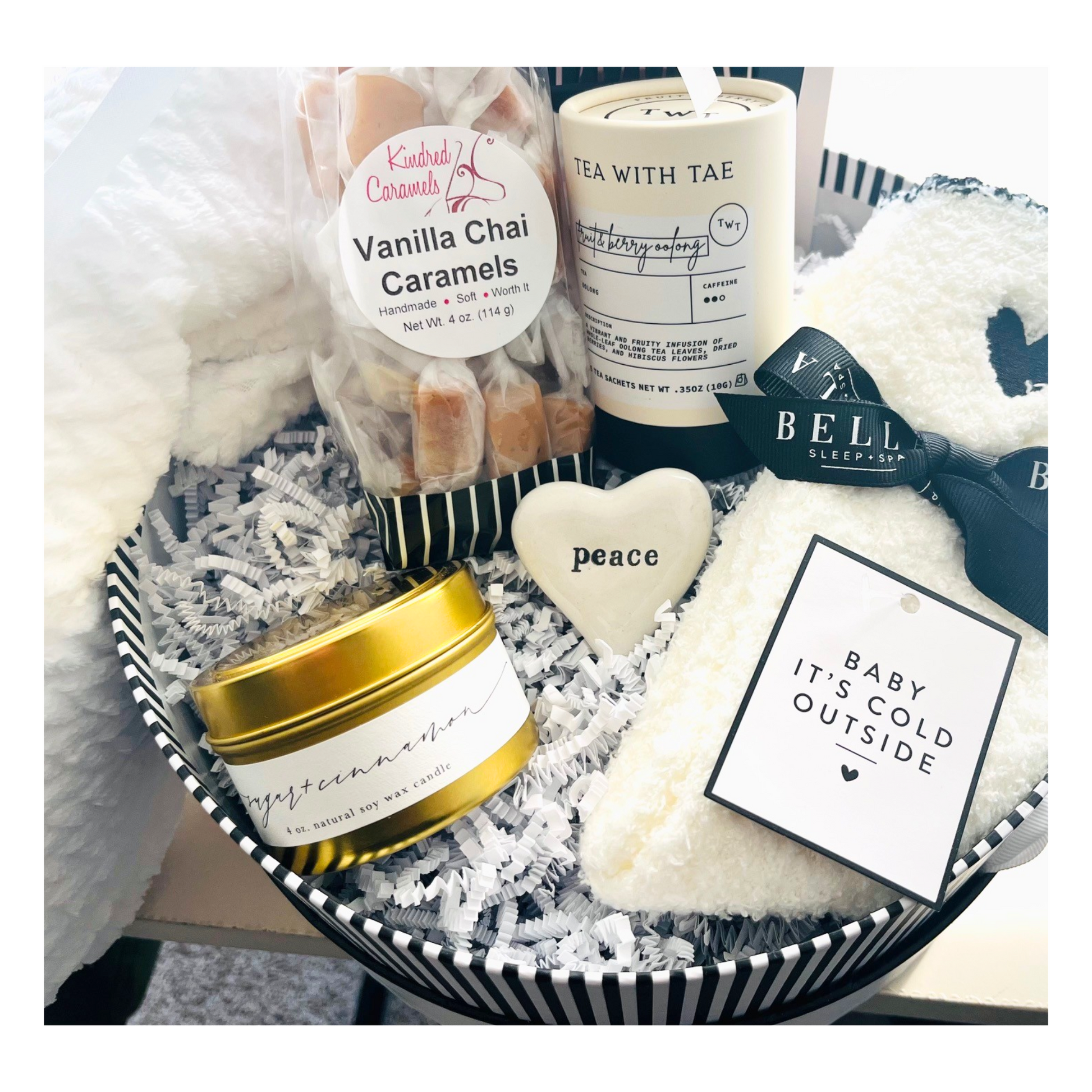 Our unique round gift box is sure to make anyone's day. Includes soft fuzzy socks with a heart, stone heart with "Peace" engraved, chai vanilla caramels for something sweet, and amazing candle tin. This is perfect for sympathy gift for her or even for a birthday or engagement gift! Ships quickly.