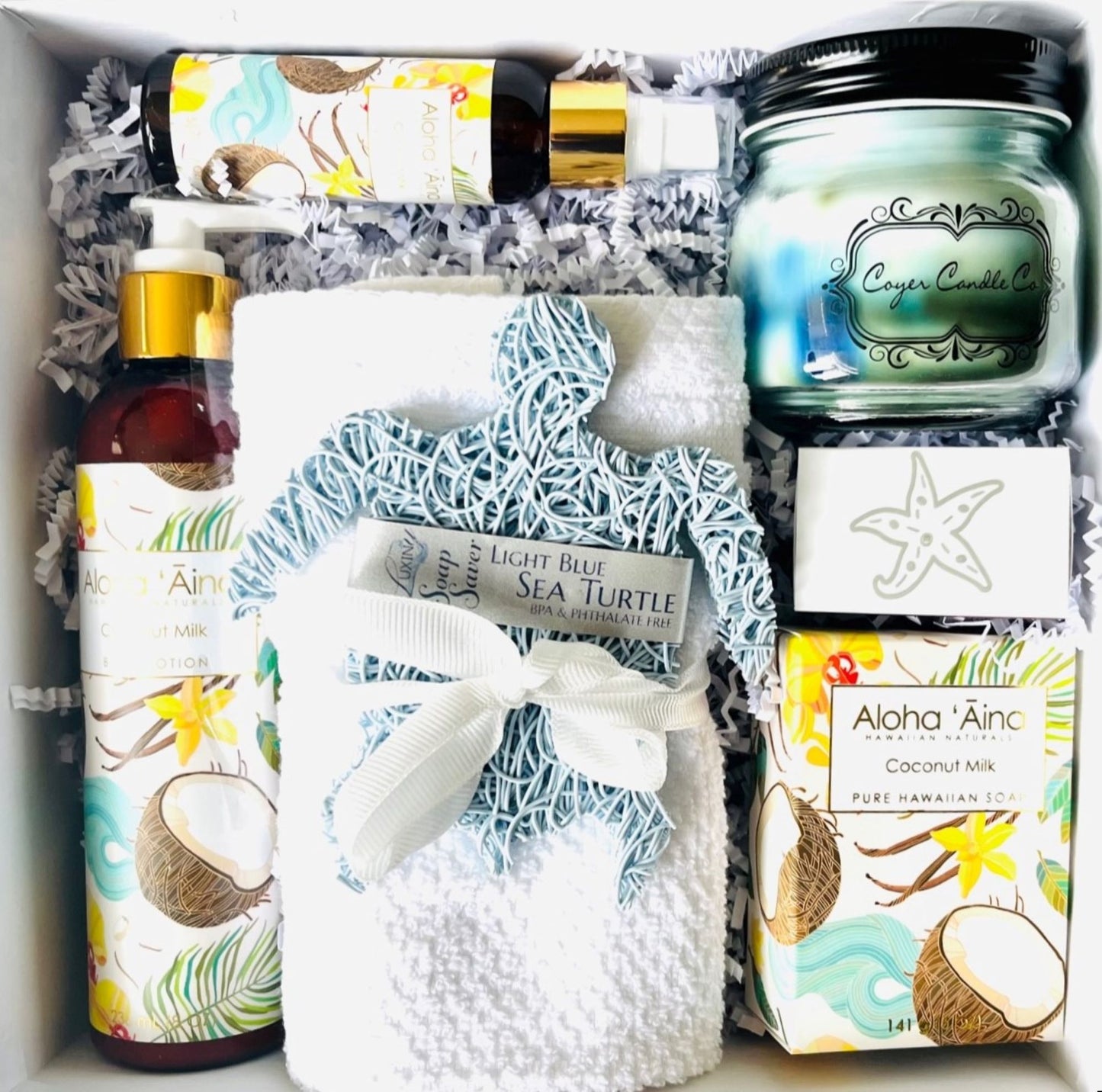 Our Relax By The Sea Gift Box is full of coastal spa related items. Incudes beach themed candle, starfish match box, heavenly Coconut Milk soap, with coordinating mist and body lotion, turtle soap saver, plush washcloths all tucked in a glossy box with Relax by The Sea on front of box.