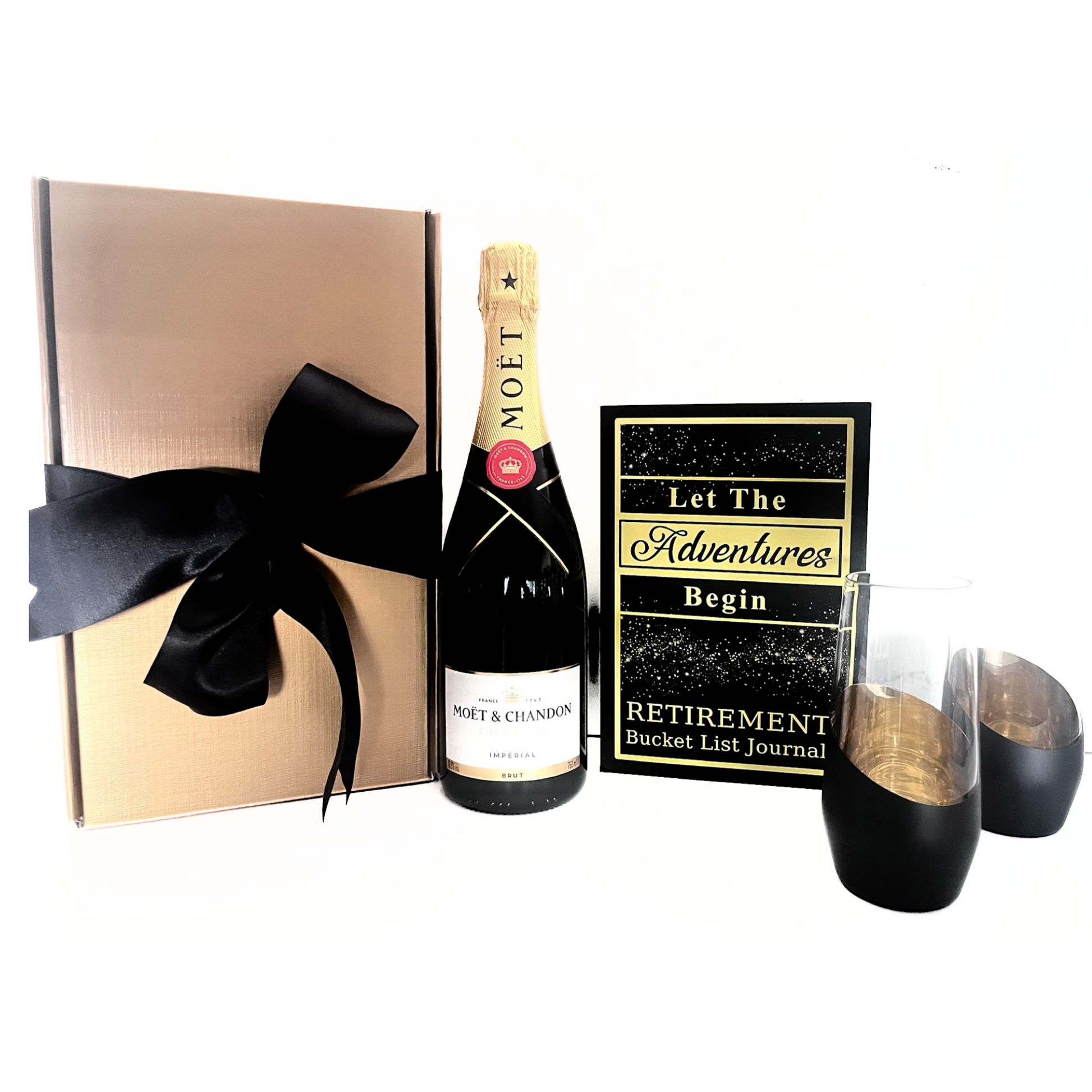 A Retirement Gift Box that is sure to please! Includes Moet Chandon Champagne, two unique elegant champagne glasses and Retirement Bucket List Journal. ALso includes confetti wand.