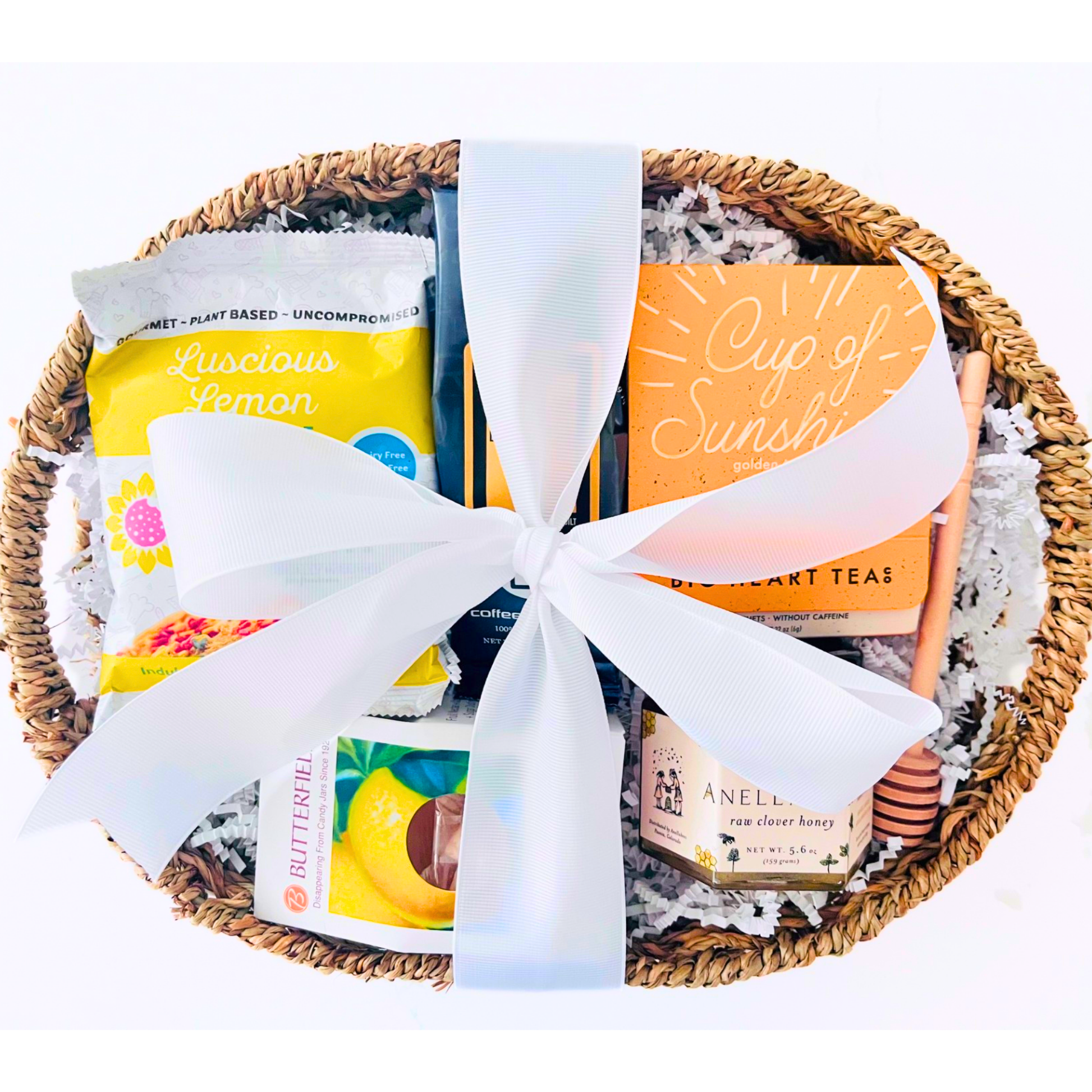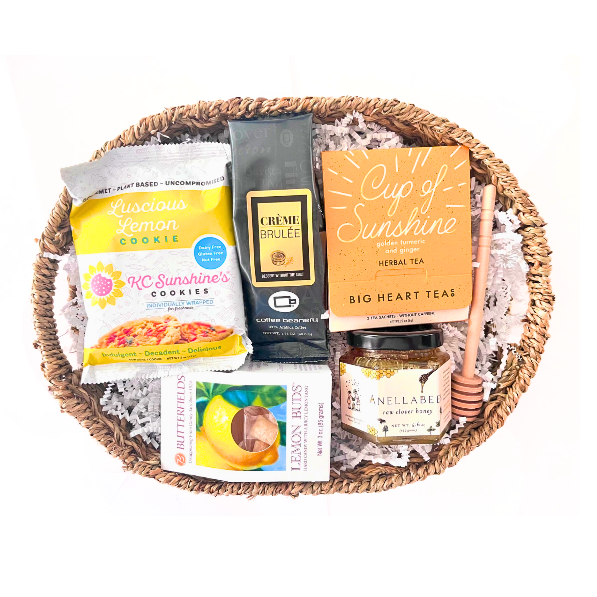 Our Sunshine gift tray has bright and cheery treats including tea, coffee, luscious lemon cookie, lemon bud candies and honey. Perfect way to cheer someone up or send well wishes. Seagrass tray is reusable.