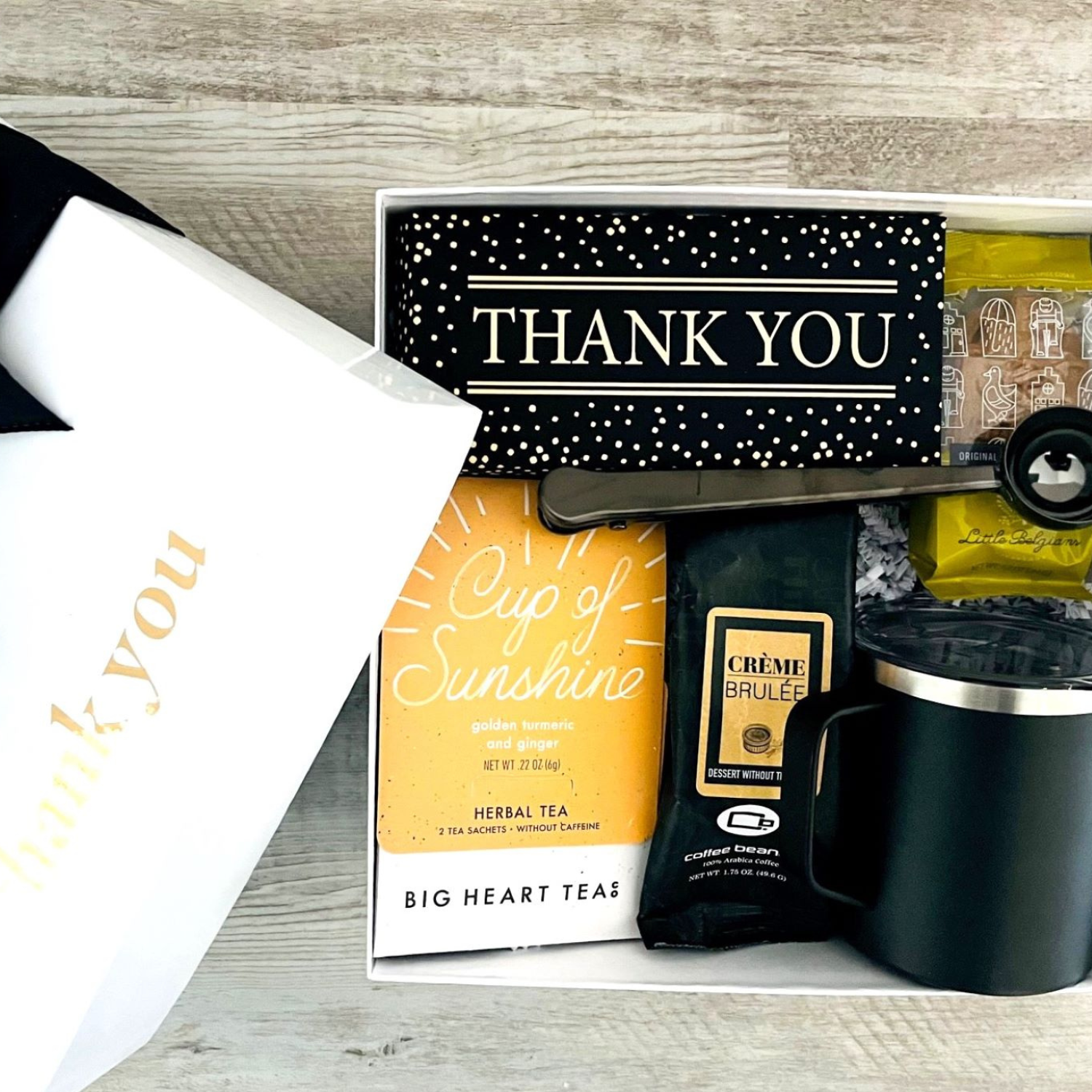 What a wonderful way to show someone special just how much you appreciate them! This thank you gift box is the perfect combination of thoughtful and delicious items - the thermal coffee mug with lid, coffee, coffee scooper, Sunshine tea, delicious cookie snack pack, and decadent chocolate bar are sure to make them feel truly loved and appreciated! This is a great gift to give in any situation - as a closing gift, business gift, or simply to show your appreciation.