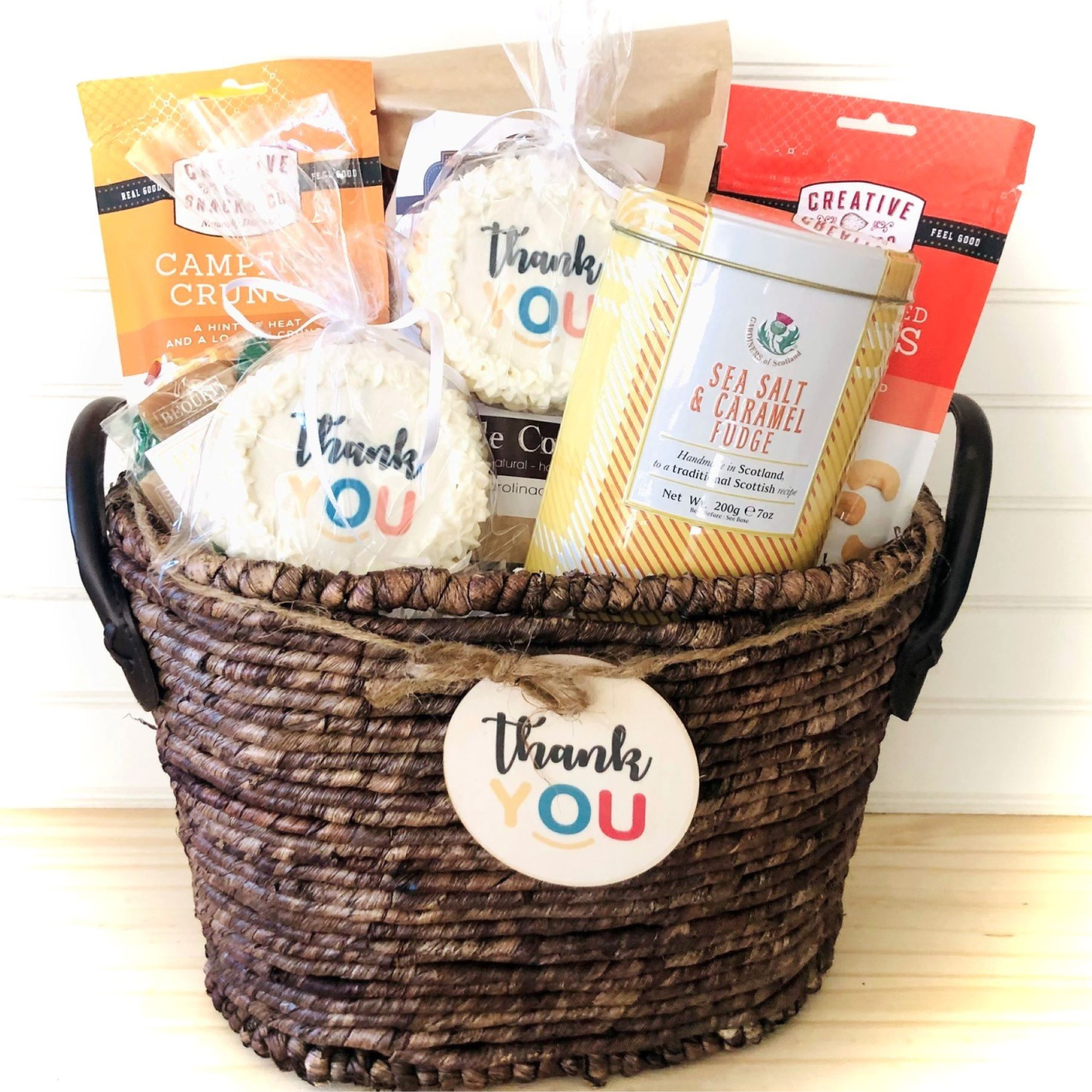 This Thank You Goodie Gift is a perfect way to thank a friend, co-worker, employee or client! Our selection of sweet and salty favorites like assorted fudge, snack mix, popcorn, more goodies, along with three thank you sugar cookies with decadent white chocolate icing, are sure to make your recipient(s) feel appreciated. We can also personalize your gift with your logo or message, and we can even substitute chocolate for other treats during the summer months. We look forward to helping you show your gratitude!