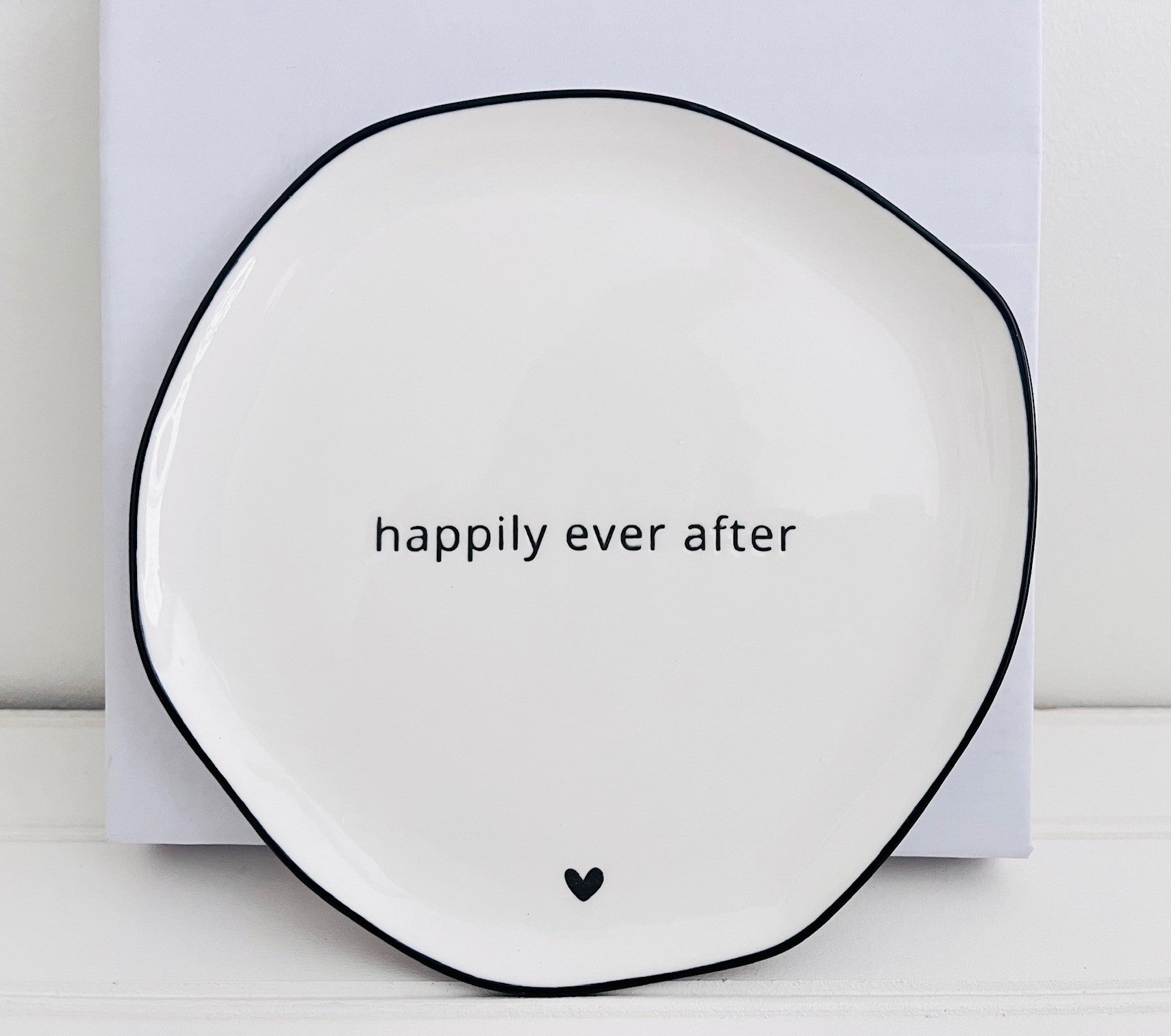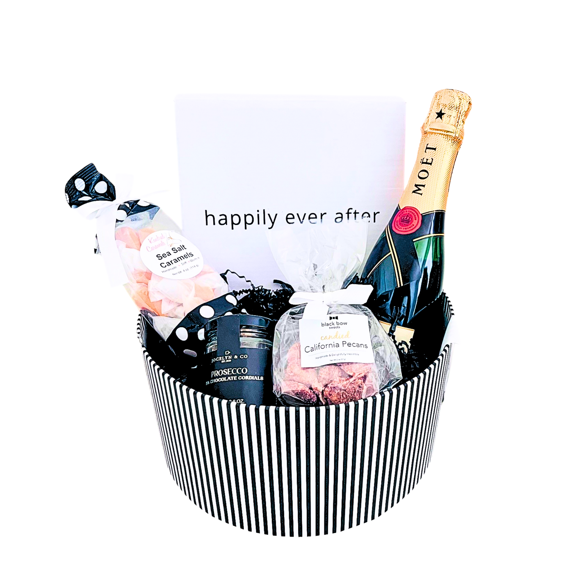 Celebrate love with the Happily Ever After Wedding Gift, featuring a bottle of Moët Chandon (375 ml) champagne, delectable treats such as prosecco cordials and sea salt caramels, candied pecans, and an elegant Happily Ever After wedding plate. Perfectly curated for engagements or weddings, this sophisticated gift adds a touch of luxury to any celebration, making cherished moments even more memorable. Round gift box with black and white stripes and white satin ribbon.