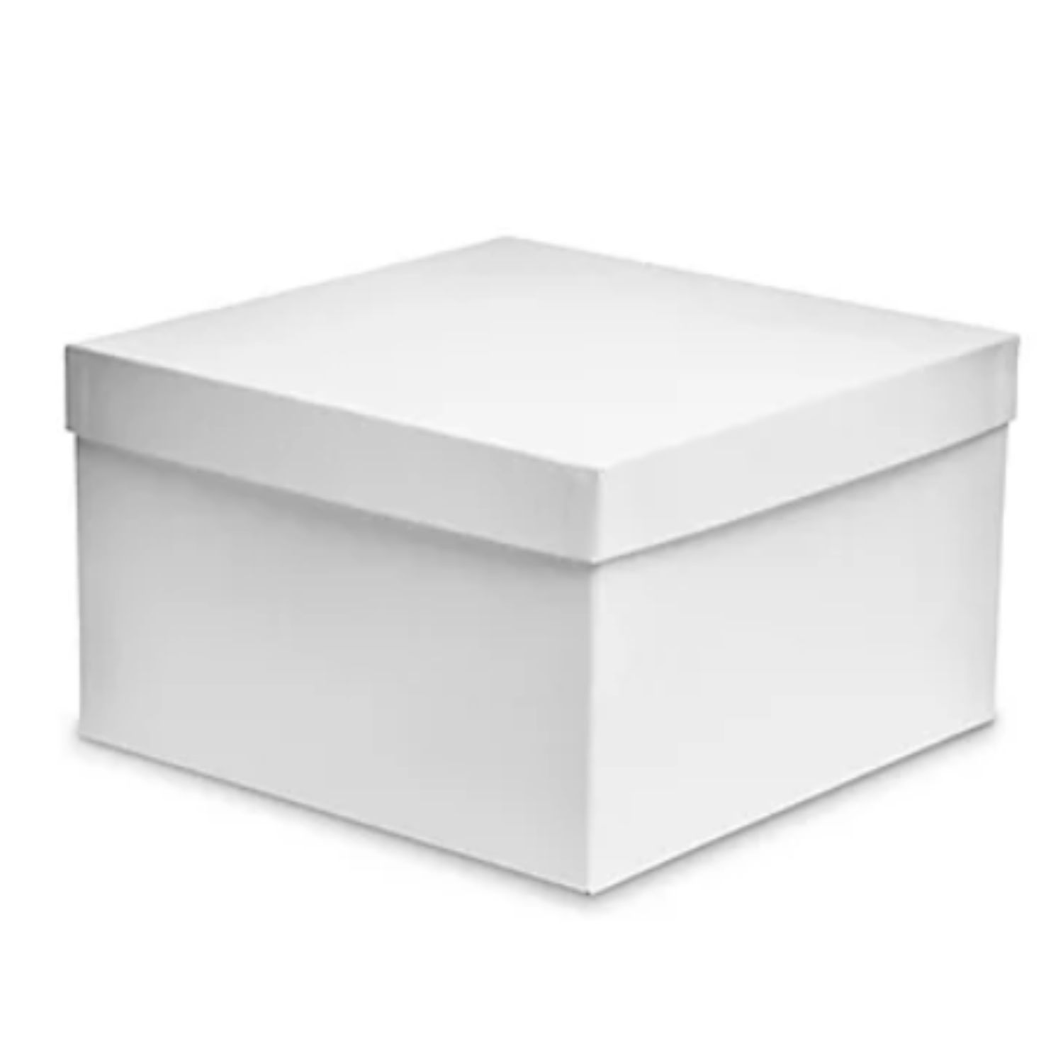 Sturdy white box with lid and glossy white outside. 11 x 11 x 6