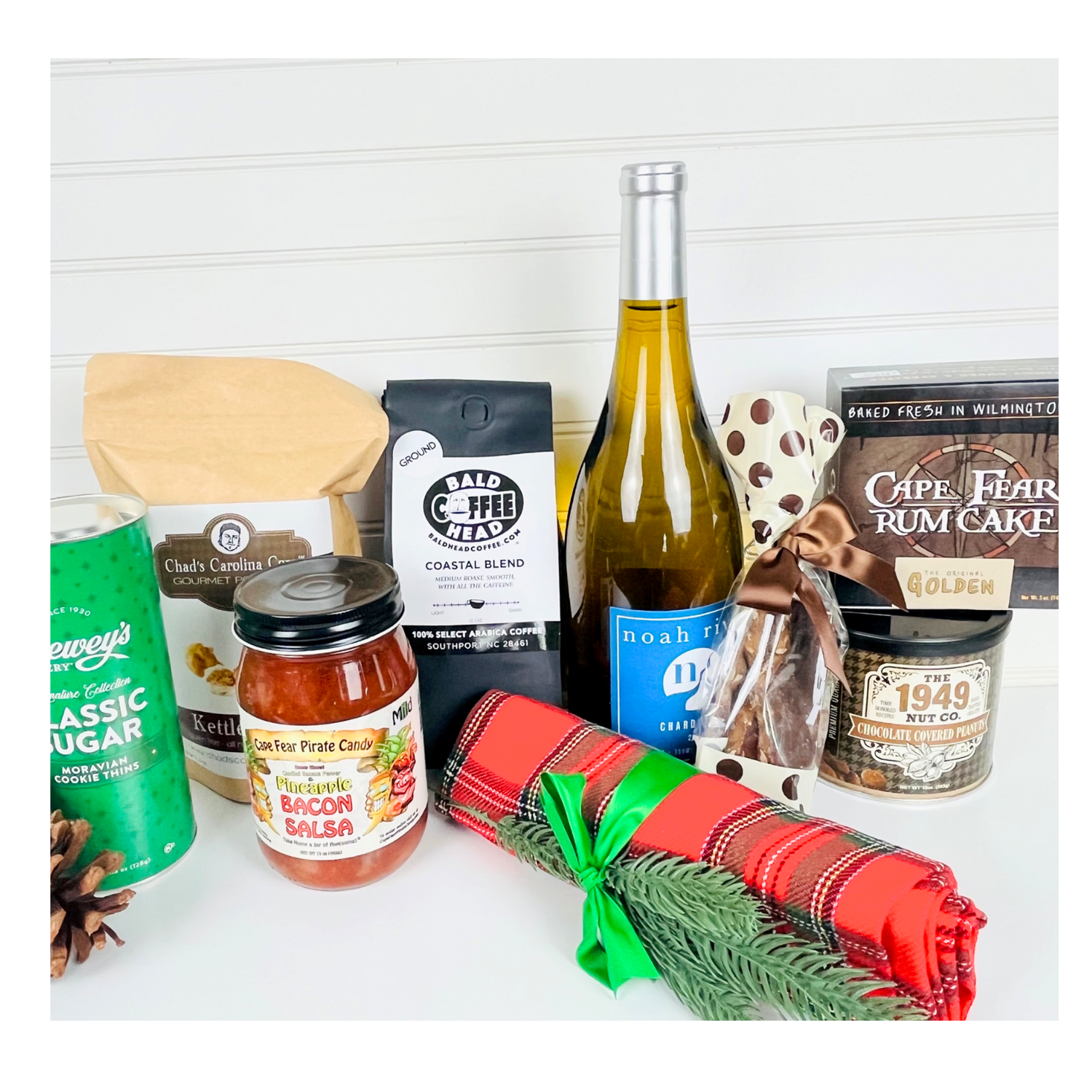 This gift has something for everyone from local and North Carolina makers. Includes goodies such as 5 oz Cape Fear Rum Cake, Dewey's Sugar Cookies, Bald Head Coffee, (1/2 lb. ground) Chocolate Pecan Toffee (or Peanut Brittle during warmer months), local popcorn, Cape Fear Pirate Candy Salsa and delicious gourmet peanuts. Includes full bottle of Chardonnay or wine of choice with wine opener. Ships free in the US. Select preferred wine or Chardonnay will be the default option.